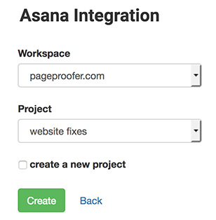 Select the Asana workspace you want connected to your PageProofer site and then select or enter the name for the Project that will be used in Asana to store the PageProofer notes. If the workspace uses teams you will also need to select a Team.