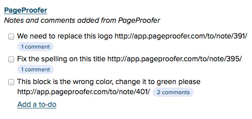 Once you start adding notes in PageProofer you will see them added to the Todo list in Basecamp