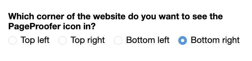 The PageProofer icon defaults to be displayed in the top left corner on the website it is embedded in but you can easily change it to be placed in any corner of a website. Sign into PageProofer, select the site you want to change and click the ‘Site Settings’ (gear icon) link in the top right corner. On the ‘Settings’ tab select either ‘top left’, ‘top right’, ‘bottom left’ or ‘bottom right’ as the location for the PageProofer icon on your website.