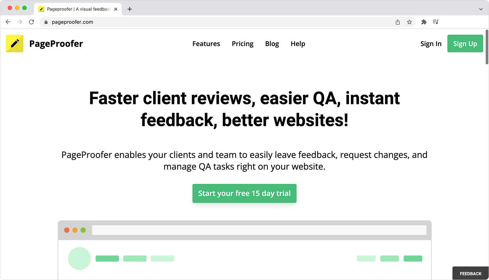 When you have guest feedback enabled in PageProofer, anyone who visits your website will see a ‘Feedback’ button in the lower corner. They can click the button and leave some feedback about that page.