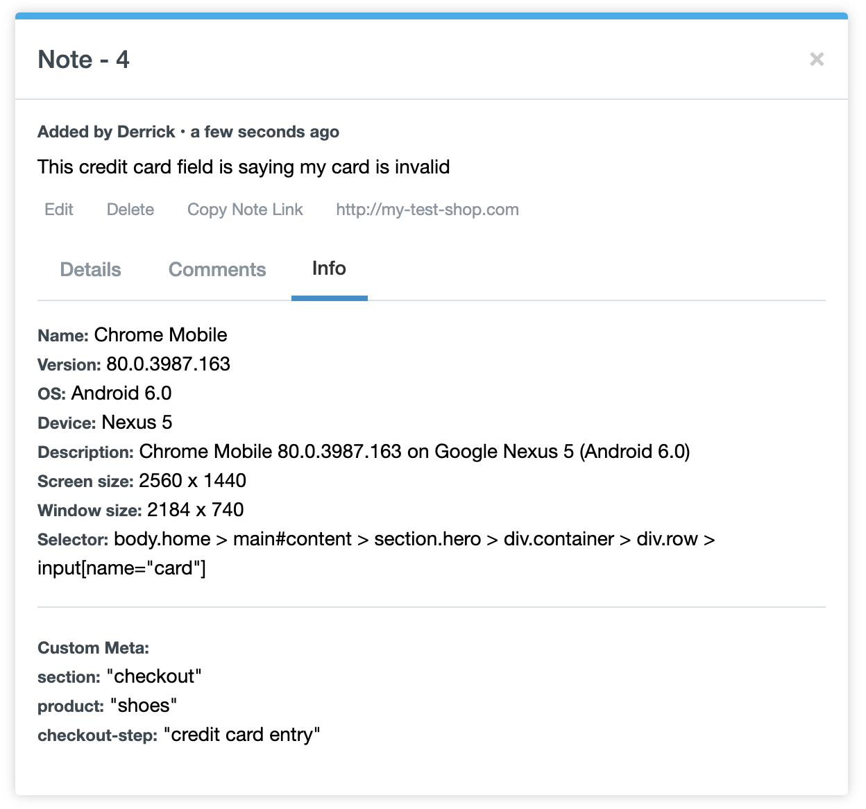 You may have times where you need to add additional meta data to notes in PageProofer. If your website is an SPA (single page application) and you want to store some state data on a note or you have some extra information that would be useful when debugging a problem, you can use the PageProofer config object. The config object allows you to set additional information that will be added to the ‘Info’ tab on a note under the ‘Custom Meta’ section.
