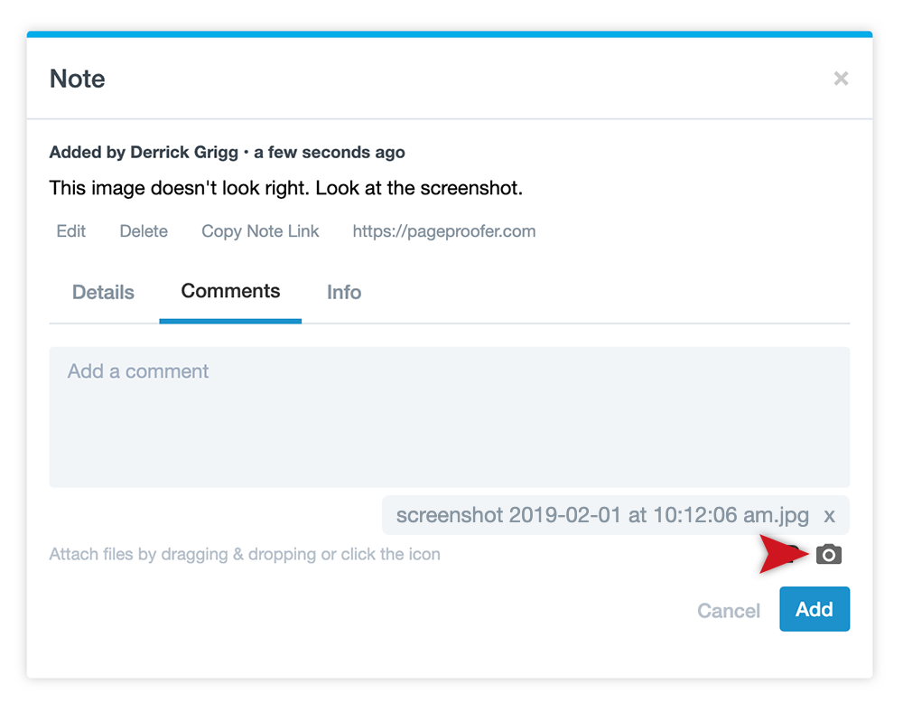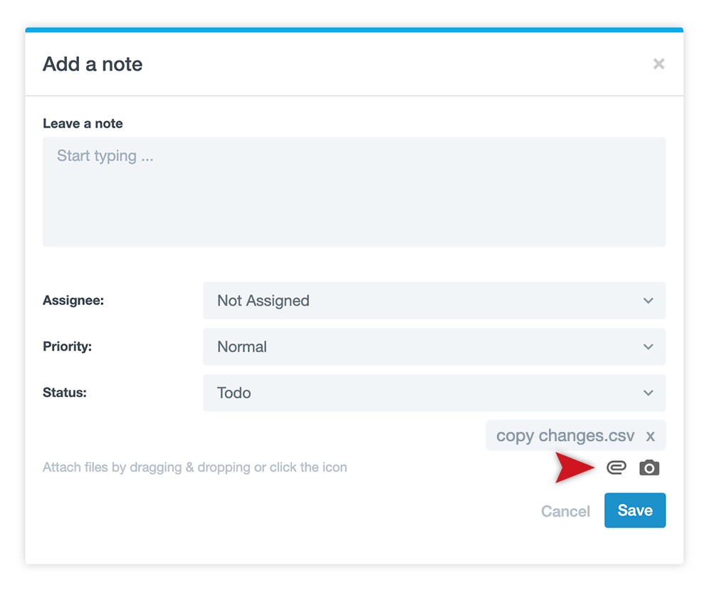 Attachments can be quickly added by clicking the paperclip icon or by dragging and dropping a file onto a note or comment area. As attachments are added they are listed just above the paperclip icon. You can add multiple attachments to any note or comment. To remove an attachment just click the ‘x’.