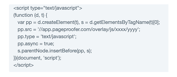 Make sure you have added the embed code to the page on your website that you are looking at. Ideally the embed code is added to a footer element that is used on every page on your website. If you check the page’s html source and don’t see the embed snippet, sign into PageProofer, go to the ‘Site Settings’ page for the site you are working on and click the ‘Javascript Embed’ tab to get the snippet. Add it to the website.