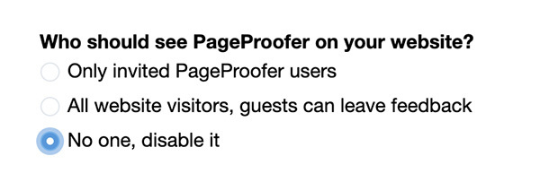 If the embed snippet is on your website and you are still not seeing the PageProofer icon check the ‘Site Settings’ to see if the disable option has been checked. If it’s checked change the option to ‘invited users’.