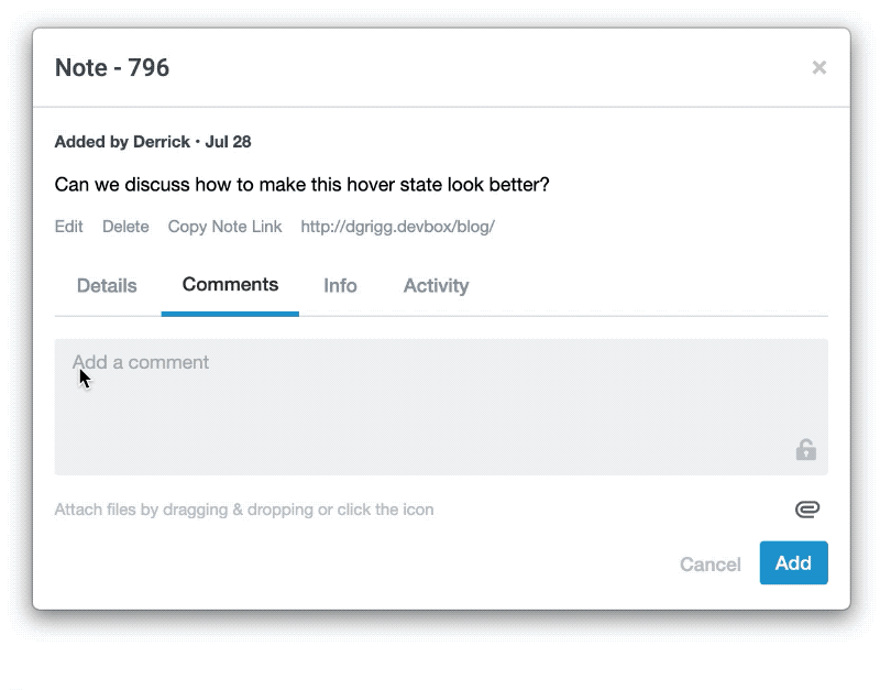 Sometimes you need to get someone’s attention right away. @mentions in notes and comments let you do that. Simply type the ’@’ character and select the person to mention. Once the note/comment is saved a notification will be sent right away to the user(s) mentioned.