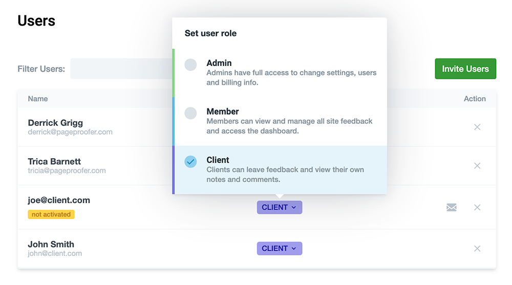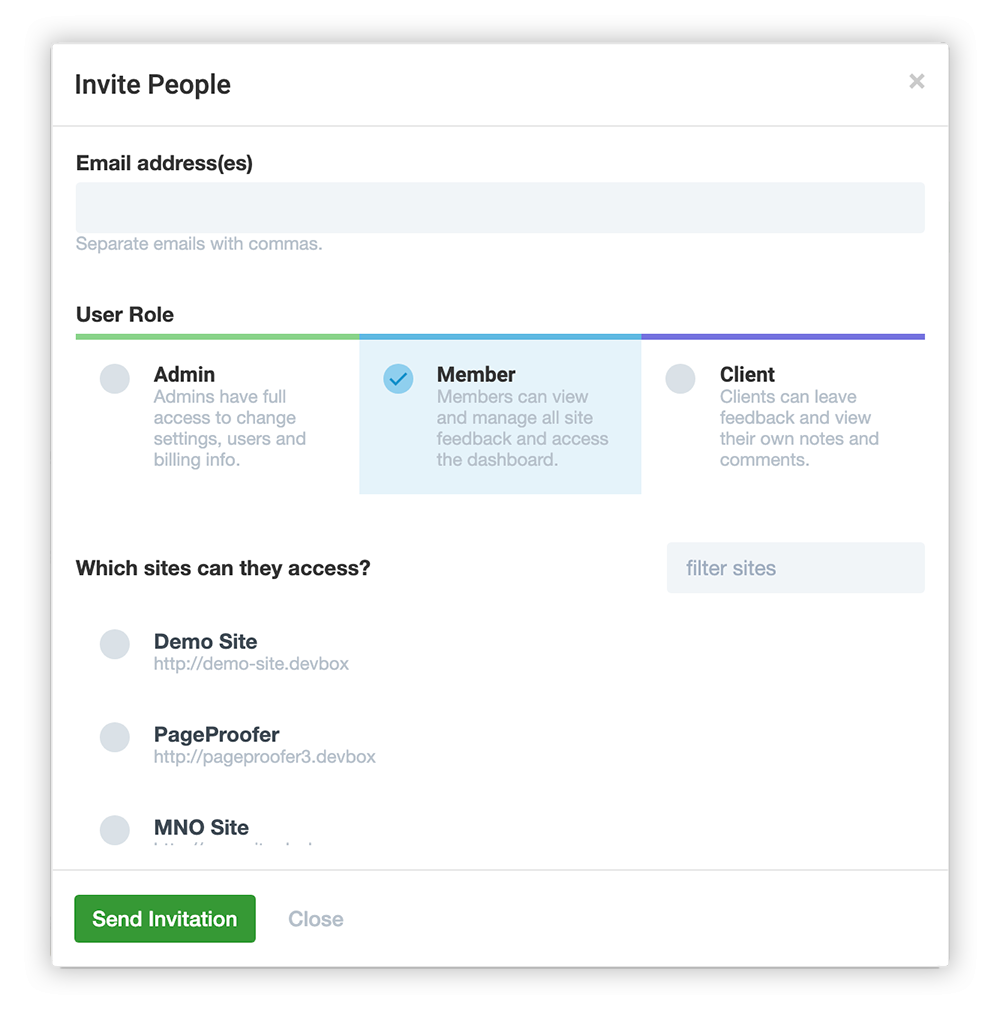 When you invite new users you can set their user role and select the site(s) they can use PageProofer on. For more information about user roles click here.