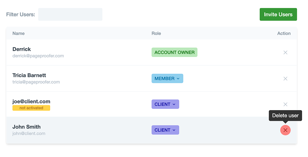 You can quickly add, manage and remove users on your PageProofer account in the Account/Users screen (only available to Admin users).