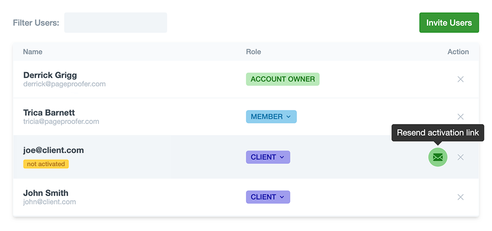 You can easily change a user’s role and resend activation emails from the main user list.